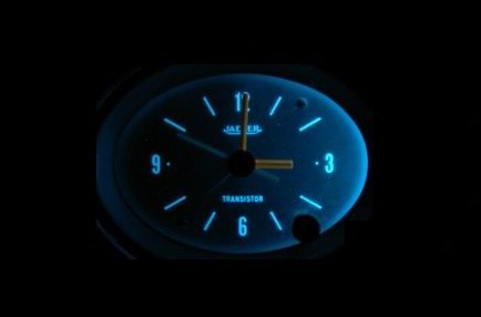 Wer genau hinsieht, bemerkt neben der renommierten Marke „Jaeger“ auch den Hinweis auf die verwendete Technik dieser Elektrouhr: Transistor. Es handelt sich hierbei um eine Art Hybriduhr, in der klassisch, wie bei einer vollmechanischen Uhr, eine Unruh für den nötigen Takt sorgt. Statt von einer aufgezogenen Feder erhält diese aber ihre Energie von transistorgesteuerten Magnetimpulsen.