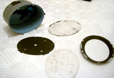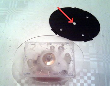Das ovale Plexiglas der Originaluhr passt auch schon hervorragend, die schwarze Metallunterlage allerdings noch nicht, weil ihr zentriertes Loch zu klein für die neue Zeigerachse ist: