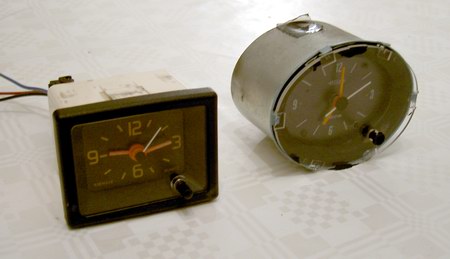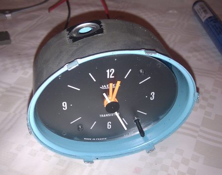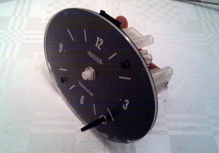Wir man dem Bild entnehmen kann, sind die Zeiger vom Original praktisch nicht zu unterscheiden, zumal der Sekundenzeiger mitsamt Achsabdeckung original bleibt. Lediglich der Einstellregler rechts unten hat nicht mehr den breiten Knopf, ist dafür aber in der Bedienung leichter als das Original. Jetzt verbleibt nur noch der Einbau ins Armaturenbrett und man hat endlich Ruhe…