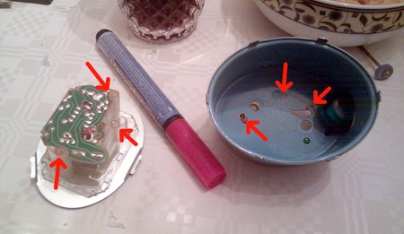 Da die Schraubenlöcher der Dose nicht mit den Gewinden des neuen Uhrwerks übereinstimmen, müssen wir ein neues Loch an der richtigen Stelle bohren. Um die richtige Stelle zu finden, tragen wir mit einem Lackstift etwas Farbe auf die Gewindehülsen des Uhrwerks und setzen dieses richtig in die Dose ein. Dies markiert die möglichen Bohrstellen auf dem Blech: