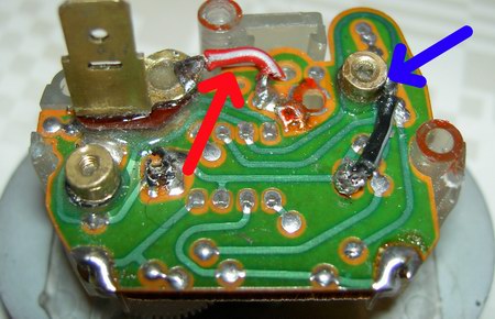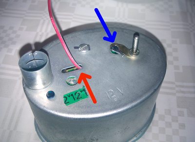 Das schwarze Minuskabel löten wir direkt and die Metalllasche der Gehäuserückseite neben dem Stift (blauer Pfeil), an das rote Pluskabel crimpen wir eine Metall-Lasche. Damit ist der Elektrikteil abgeschlossen und wir wenden uns den Zeigern zu. In Farbe und Form sind die Zeiger der Austauschuhr sehr ähnlich und können direkt eingebaut werden. Wer es ganz perfekt haben will, lackiert die Zeiger vorher noch mit dem Farbton „Pastellorange matt“ (Kunststoffgrundierung vorher nicht vergessen!), so dass sie farblich vom original nicht mehr zu unterscheiden sind.