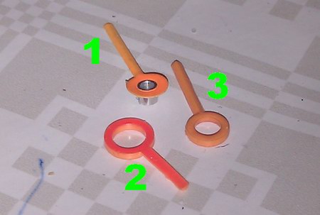 Im Bild oben sehen wir den originalen Zeiger (1), den Ersatzzeiger von der Quarz-Uhr (2) und den fertig lackierten Austauschzeiger (3). Wir schieben den Stunden- und danach den Minutenzeiger so auf ihre Achsen, dass sie auf 12Uhr zeigen.
