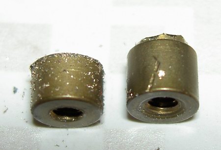 Nachdem wir beide Gewindezylinder ausgebaut haben, spannen wir sie in einen Schraubstock und feilen sie auf ca. 2mm Stärke herunter. Da das Messing sehr weich ist, geht das in wenigen Minuten.