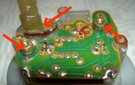 Wir lassen den Kleber komplett aushärten und widmen uns der Elektrik. Wie in dem folgenden Foto zu erkennen, verlöten wir die Lasche mit dem Pluspol, das rechte Gewinde mit dem Minuspol der Platine, das war es auch schon.