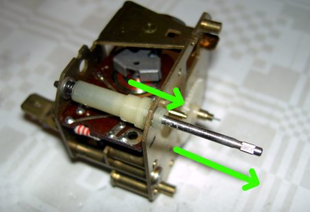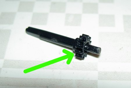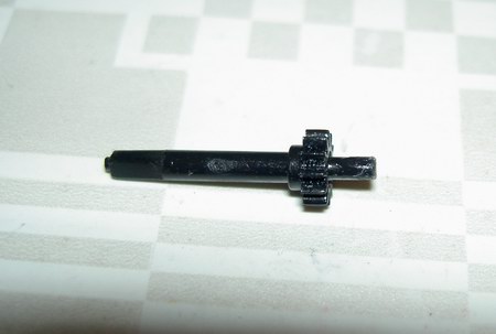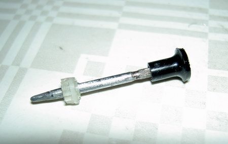 Nachdem wir Achse ausgebaut haben, kürzen wir sie auf der Laufwerkseite soweit, dass die gekürzte Metallachse ungefähr 4mm länger ist, als der Plastik-Justageregler der Quarzuhr. Nun spitzen wir das gekürzte Ende mit dem Dremel etwas an. Im folgenden Schritt schneiden wir die Achsen der Plastikachse ab, bis nur noch das kleine Plastikritzel übrig bleibt:
