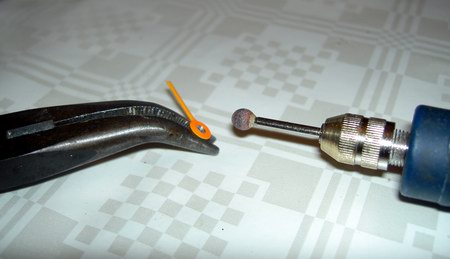 Ein Problem ist gelöst, das nächste steht vor der Tür: Die Löcher in den Zeigern sind zu klein, um auf die Achsen des Quarzwerkes zu passen. Also muss man die Achslöcher der Stunden- und Minutenzeiger mit dem Dremel und einem kleinen Schleifeinsatz ganz vorsichtig vergrößern, bis sie im Innendurchmesser den Quarz-Zeigern entsprechen. Von letzteren kneifen wir die Zeiger ab, so dass nur noch die Plastikringe übrig bleiben: