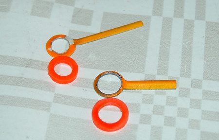 Anschließend klebt man die Zeiger vorsichtig und deckungsgleich mit hochwertigem Komponentenkleber auf die Ringe. Da sie durch die ganze Schleif- und Klebeprozedur gelitten haben und in der Regel eh im Laufe der Jahrzehnte farblich verschossen sind, ist es Zeit für eine kleine Auffrischung. Im Baumarkt besorgt man sich den Farbton „Pastell-Orange matt“, was haargenau der Originalfarbe entspricht, und lackiert die Zeiger neu: