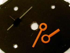 Von vorne nimmt das Ganze nun auch langsam Gestalt an, doch es fehlt noch das Wichtigste: Die Originalzeiger! Hier beginnt schließlich auch der filigranste Abschnitt der Arbeiten: Betrachtet man die ausgebauten Originalzeiger, so sieht man die eingenieteten Metallachsen in dem dünnen, orange lackierten Blech. Es gilt diese auszubauen, indem man wieder einmal mit dem Dremel die flache Seite der Niete abschleift, bis sie sich ohne großen Kraftaufwand aus dem Zeiger lösen lässt.